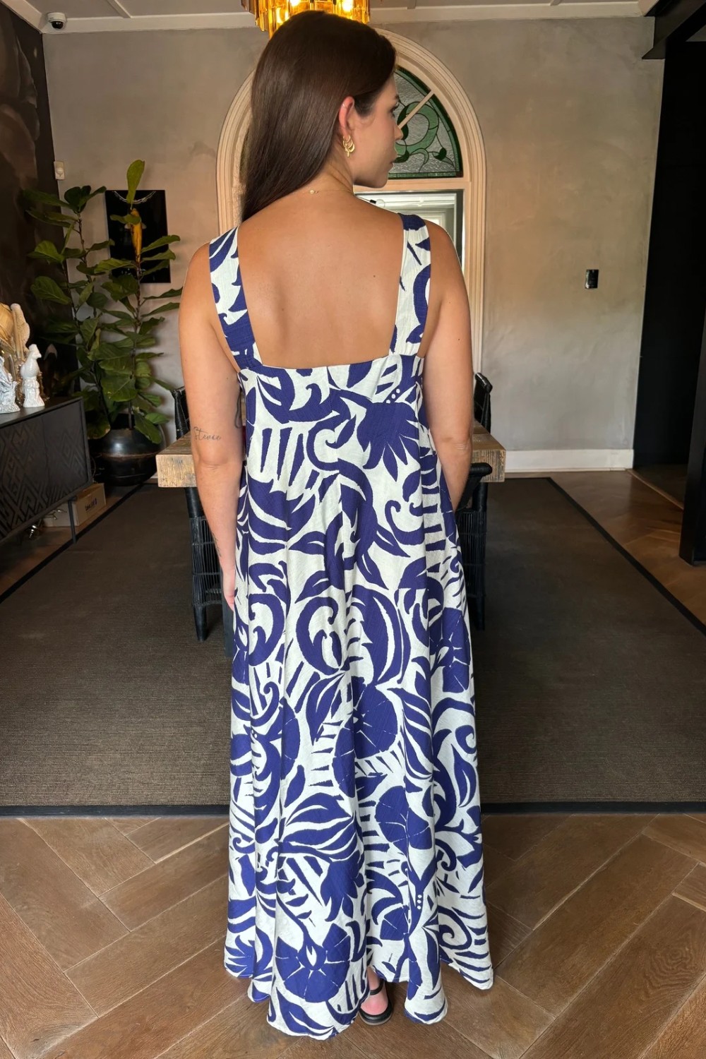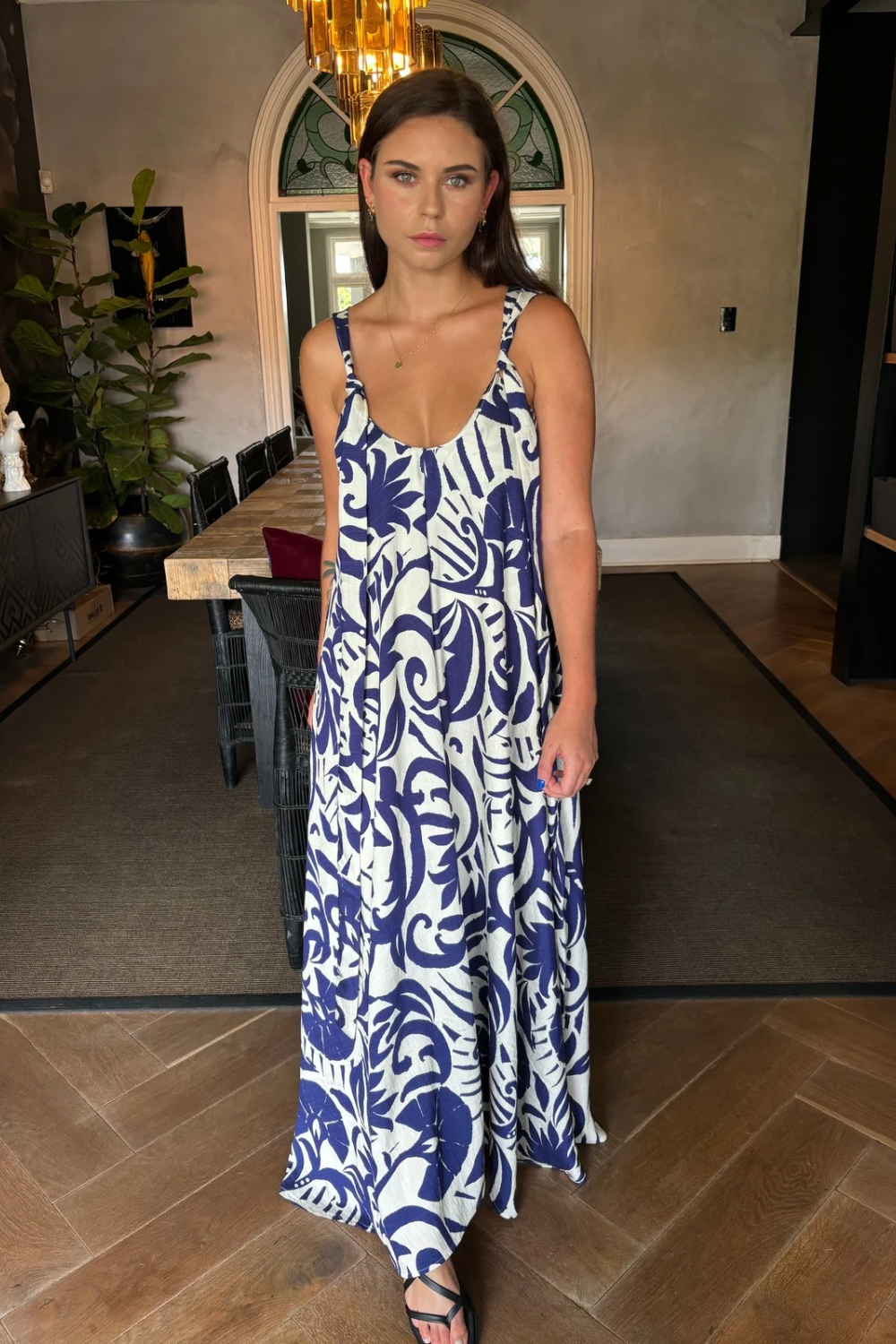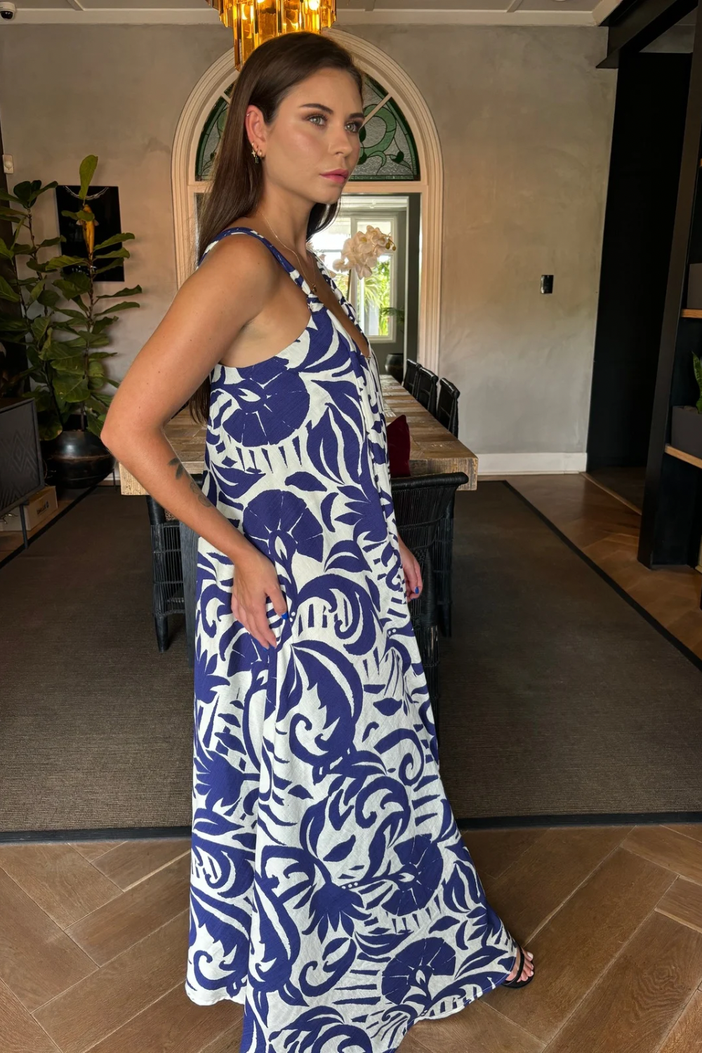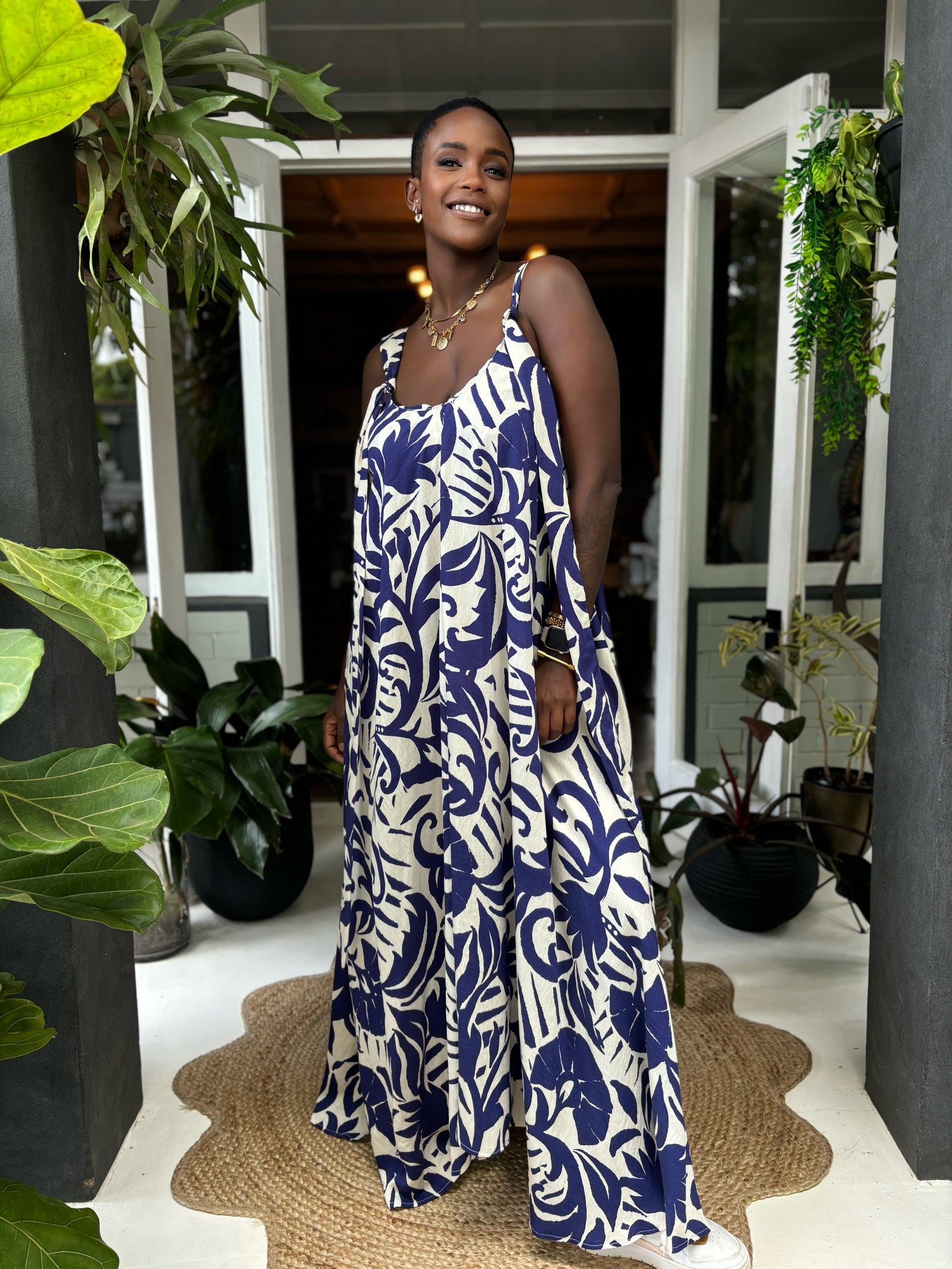 Greek-Inspired Print: Features a fresh blue and white pattern, perfect for channeling Mediterranean vibes.