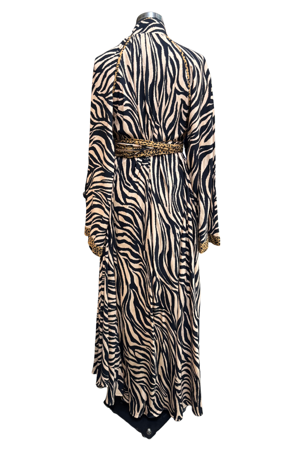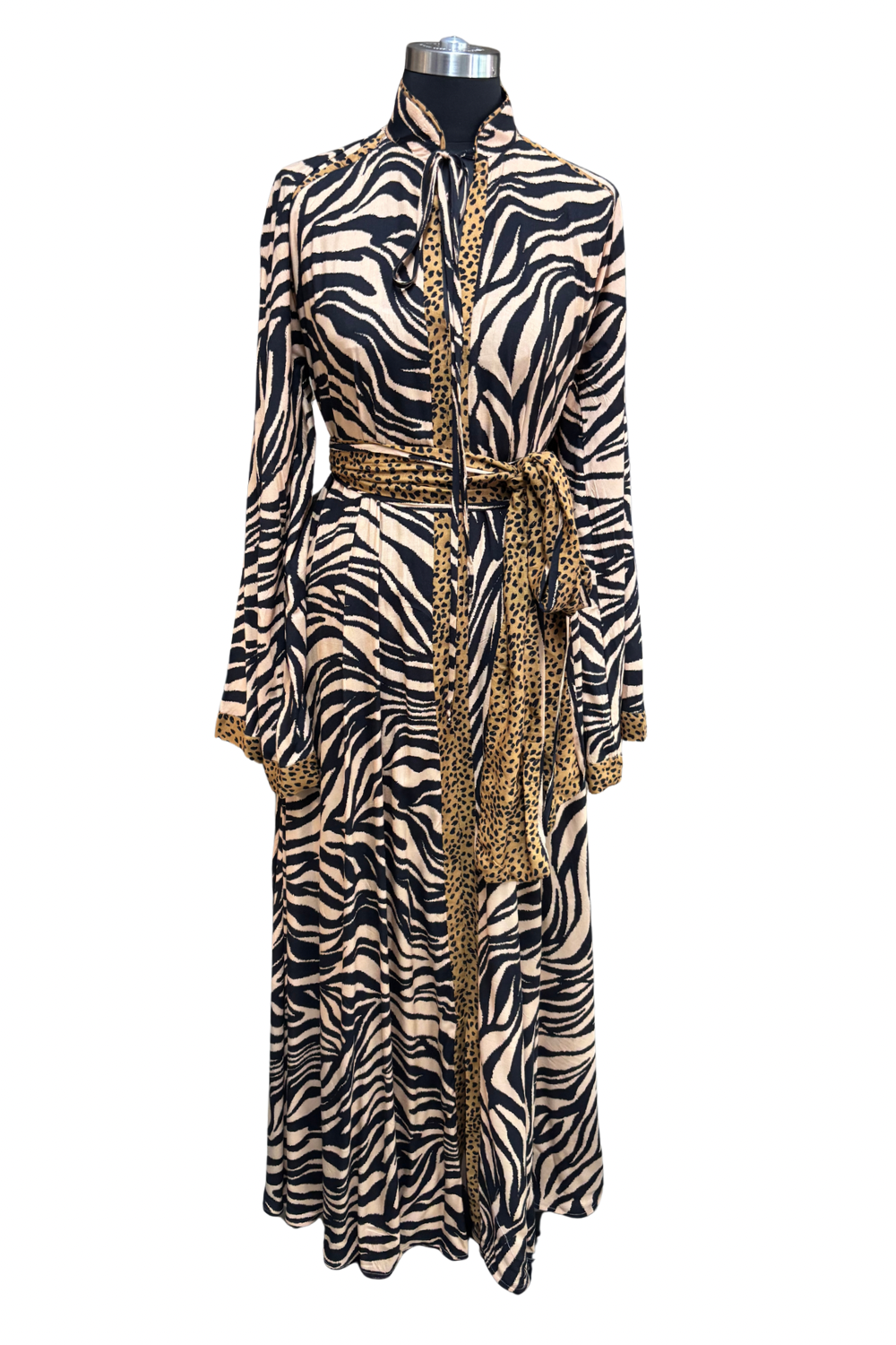 The body features a black and brown zebra print, striking yet grounded — a nod to Africa’s untamed grace. A leopard-print optional belt ties the look together, allowing you to cinch the waist or wear it loose and languid. The kimono-style sleeve, finished with a subtle welt detail, adds to its ease and timeless sophistication.